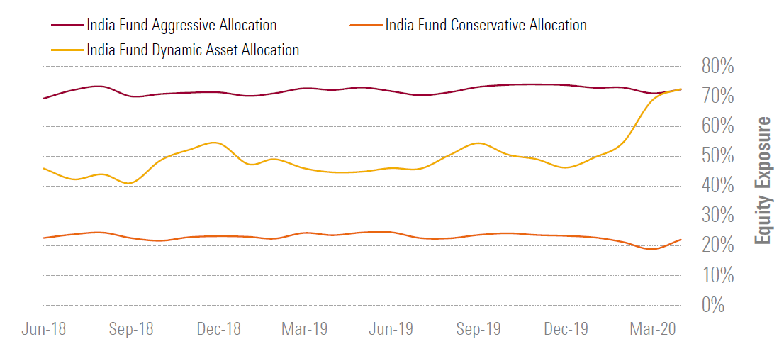 While aggressive and conservative allocation funds have kept their equity exposure around 70% and 20% respectively, DAAF have exercised their freedom to change equity allocation depending on the prevailing market conditions.